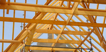 Offene Dachkonstruktion mit sichtbaren Balken aus Massivholz auf Baustelle