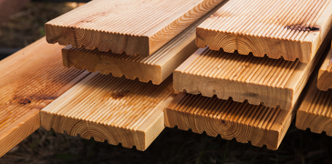 Nahaufnahme gestapelter geriffelter Terrassendielen aus naturbelassenem Holz im Aussenbereich