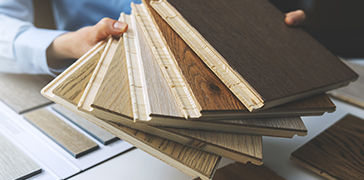 Mehrere Parkett-Muster werden von einer Person in der Hand gehalten, Auswahl unterschiedlicher Holzarten